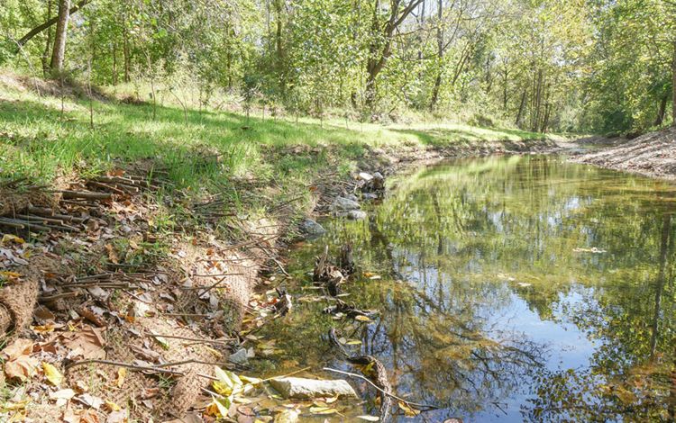 Construction crews spent the spring of 2022 digging out and rebuilding a stretch of scalloped, eroded banks along Little Creek on The Nature Conservancy's (TNC) property near Hatfield, Missouri. The new banks are gentle slopes, assembled in layers of stones, earth and tangled tree roots to accommodate the natural rise and fall of the creek. A mix of native grasses, shrubs and trees are sending down roots that will help hold it all in place while filtering any water running down into Little Creek.
