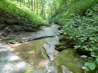 Washmorgan Hollow is a 73-acre preserve featuring a rocky creek that leads to a waterfall.